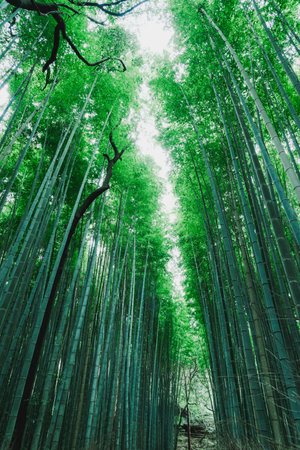 Bottom view of tall bamboo tree in evergreen forest of Arashiyama, Kyoto, Japan