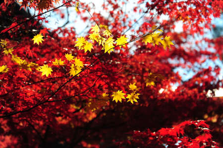 Red maple leaves in autumn season with blue sky blurred background, taken from Japan.