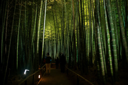 People visit Bamboo grove lit at night in Kodaiji temple, Kyoto, Japan. Famous travel destination especially for fall illumination light up in Kansai.