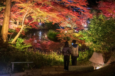 Bunkyo City,Tokyo,Japan on December6,2019:Illumination at Rikugien Garden in autumn.The contrast of the leaves against the dark night sky makes their colors seem even more vibrant than in the daytime.