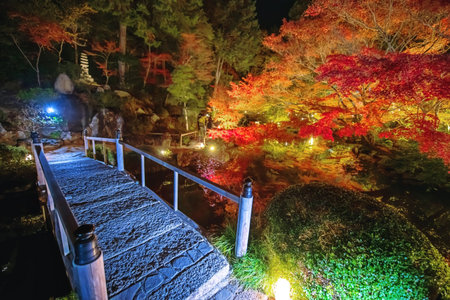 autumn night illumination of colorful maple leaves by pond, Hogonin temple garden, Arashiyama, Kyoto, Japan. Travel destination for tourist sightseeing of Kansai in fall.