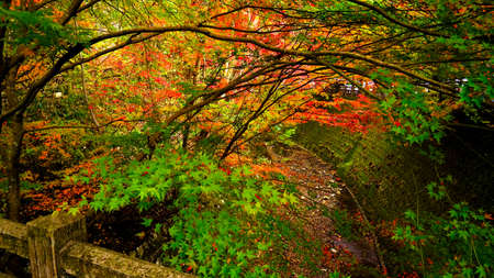 Beautiful autumn maple leaf colors along cascading water of Minoh waterfall walking trail, Minoo, Osaka, Japan. Famous travel destination for sightseeing Kansai in fall season.