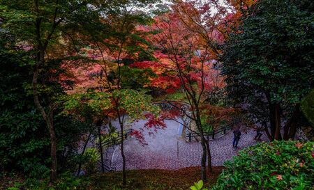 Couple view stunning autumn foliage with illumination of Kurodani Konkai Komyoji garden, Kyoto, Japan. Famous travel destination for tourist sightseeing Kansai for fall illusion.