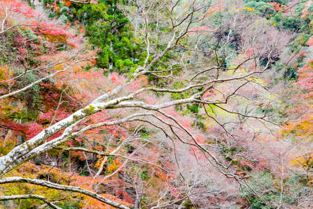 Autumn foliage colorful trees on Arashiyama mountain footpath to access to the peak viewpoint in Kyoto, Japan. Here is very famous during fall season.