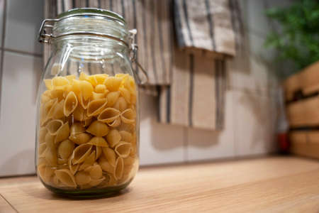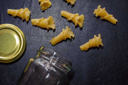 Empty glass jar with lid and Uncooked Gigli or campanelle pasta On a dark background. Variety of Italian pasta. Mediterranean traditional cuisine.