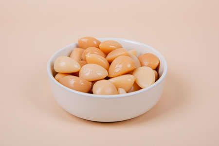 White glass bowl of raw pasta. Isolated on a dark gray background. Top view close up