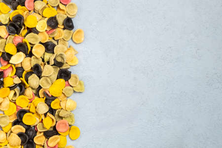 Abstract colorful pasta. Different type of pasta. Top view shot.
