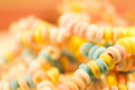 childrens dry breakfast colored corn rings on a white background with a place for text