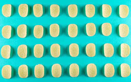 Creative pattern made of spiral macaroni on a pastel blue background.
