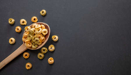 Pasta cooking concept. Fresh homemade tortellini on a wooden spoon, black stone background, top view, copy space