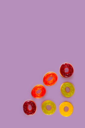 Triangle of round jelly candies at the corner of violet background. Colorful array of sweet circles