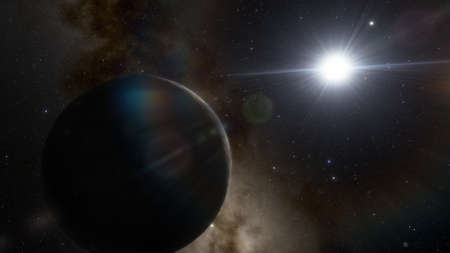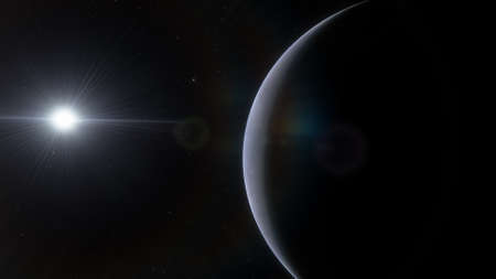 fictional Eris sun rise in dark background with stars. front view of eris planet from space. full 3d view of eris 4k resolution.