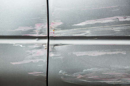 Car doors scratched during an accident, close-up damage to the paintwork of the car.