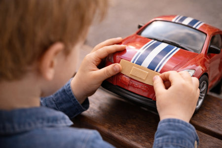 toy car is standing in the leaves in the forest. metal sports car in the fall on the ground early in the morning. Warm autumn landscape.