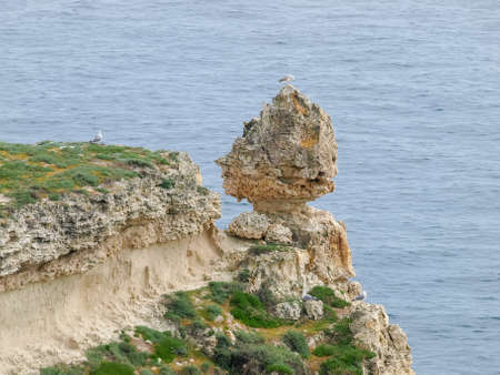 Fragment of the textured limestone rock with seagulls sitting on it on seashore on a background of water surface