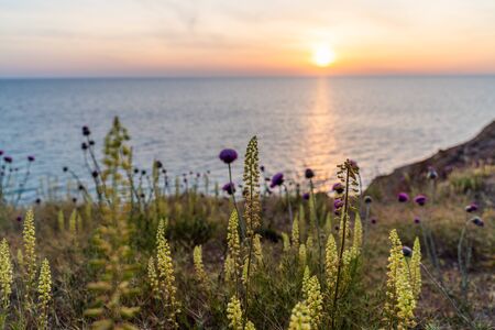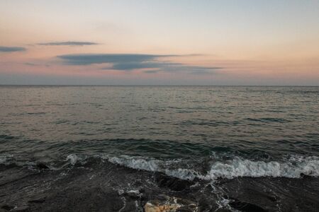 Seascape of still sea waters shore, rocky coastline and romantic pink sunset on summer clear day. Still landscapes of travels and destination scenics