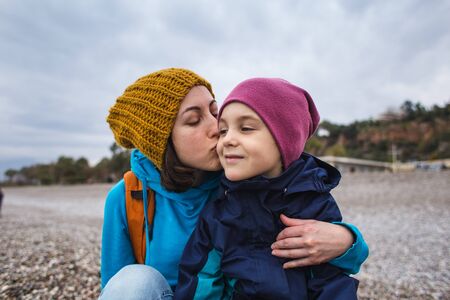 A boy with his mother sit on the beach and look at the sea waves, a woman travels with a child, rest on the coast in the cold season, mom hugs her son.