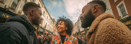Three friends share smiles and laughter while chatting on a bustling street, surrounded by a lively crowd and colorful buildings under a picturesque sky.