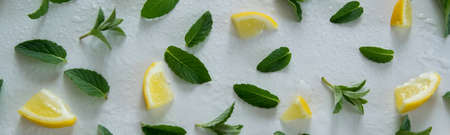 Top view of lemon slices and mint herbs on white background. Minimal refreshment concept design.