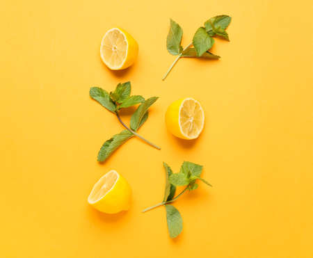 Fresh mint and cut lemon on color background