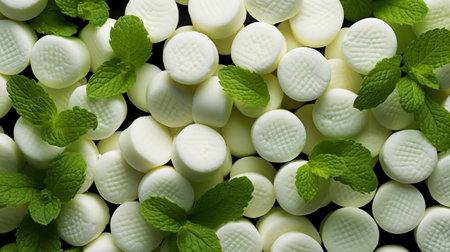 Pile of white mints candy with a green mint leaves. Generative AI.