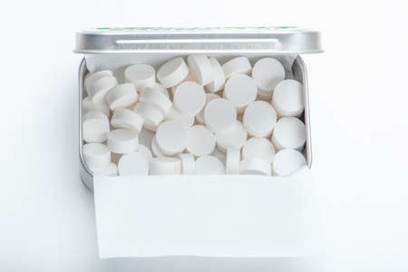 Mint candies on a white background. White mint candies in an open tin box. Fresh breath or bad breath concept