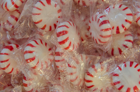 Red and white peppermint candies. Shallow depth of field. Toned.
