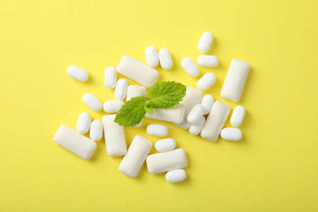 A few chewing gums lie on texture background of fashion pastel yellow color paper in minimal concept.