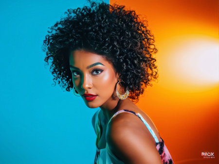 African female with braided hair and vibrant makeup smiling against bright orange background.