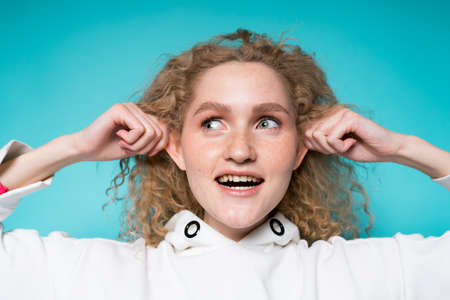 curly-haired woman pulls her ears and smiles. big eyes and straight teeth