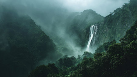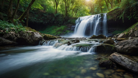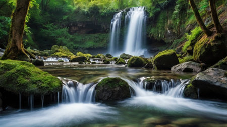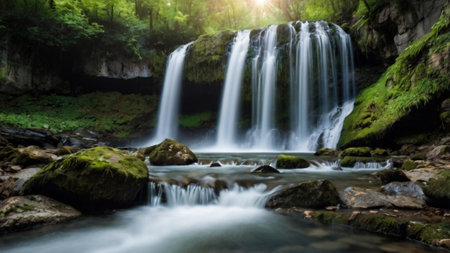 Serene waterfall in a mystical forest. Peaceful nature scene.