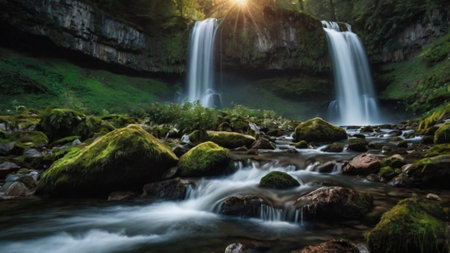 A stunning waterfall flows over mossy rocks, creating a serene and picturesque scene. The lush greenery and misty atmosphere enhance the tranquility of the waterfall.
