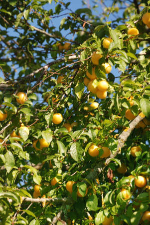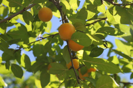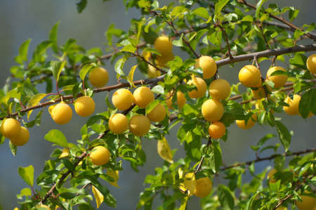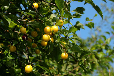 On the branches of the tree ripen fruits of cherry-plum (Prunus cerasifera).