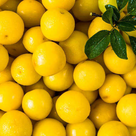 Tasty fresh yellow plums (Yellow Greengage) vintage close up background.