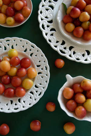 Organic fresh plums in white vintage plates on deep green background. Healthy vegetarian food. Still life with space for text