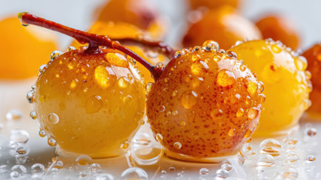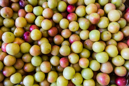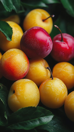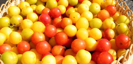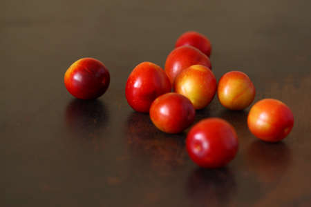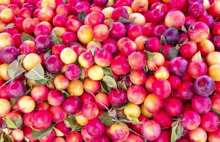 Ripe cherry plum fruits hanging on a branch, shot close-up on a clear sunny day. Can be used as a background or wallpaper and in your other design ideas.