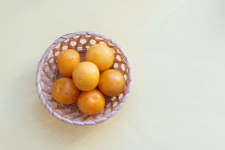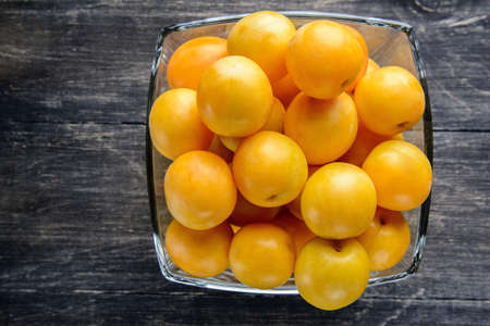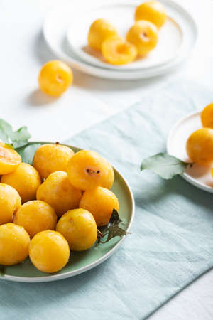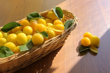 Summer concept, fresh sweet yellow plums on the table, selective focus image