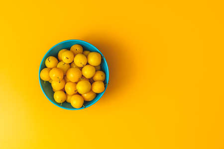 Creative summer pattern made of fresh yellow cherry plums in blue bowl on pastel yellow background. Fruit minimal concept. Flat lay.