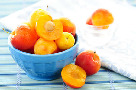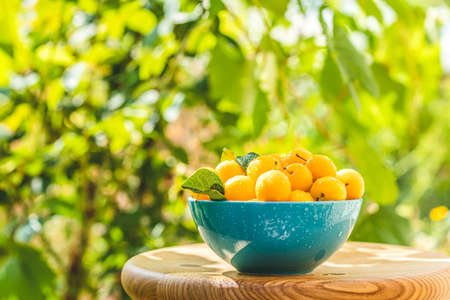 Handful of yellow cherry plums with water drops in blue bowl on the green nature background with sunny light in the garden