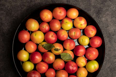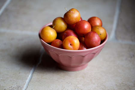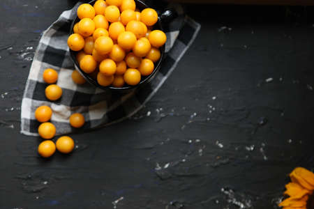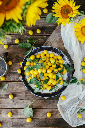 Still life with yellow cherry plum in a metal dish. Cherry plum on wood. Seasonal harvest.