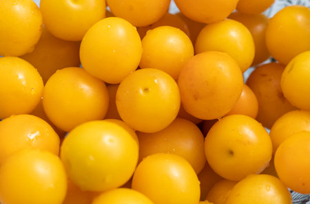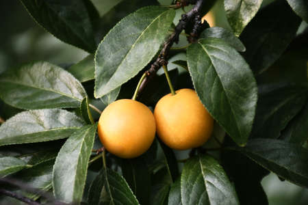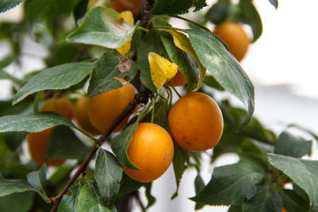 Ripe fruit of wild yellow cherry plum on a branch. Prunus cerasifera