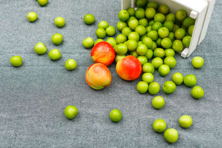 Scattered green plums with tasty peaches in a white rectangle bowl on grey background, high angle view.