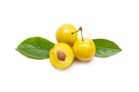 Yellow plum mirabelle fruit isolated on white background. Prunus domestica