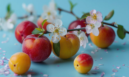 Red and yellow plums with a sprig of flowers on a pale blue backdrop