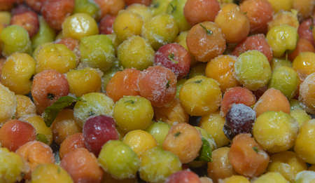 Group of frozen acerolas fruits. Fruits rich in vitamin C. Natural texture. Food for making juices and sweets.