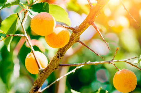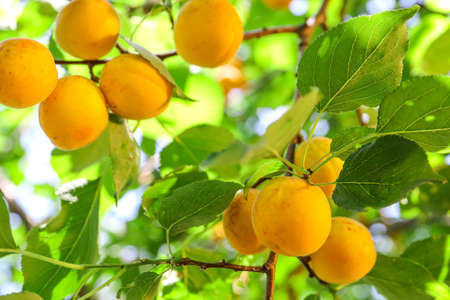 Yellow plums, ripe cherry plum on a branch in the garden with beautiful bokeh.