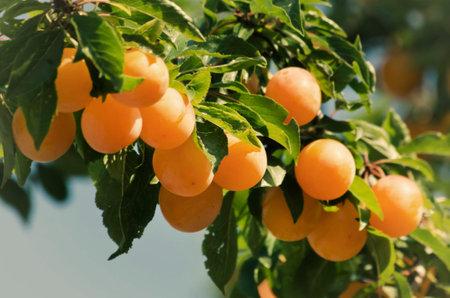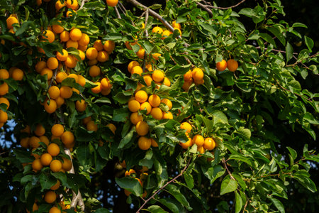 Yellow mirabelle plums ripening on the tree in a summer sunny day