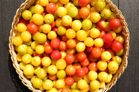 Various colorful summer fruit on outdoors. Homegrown organic yellow plums collected from yard. Basket with ripe greengage plums, mirabelles in the garden.