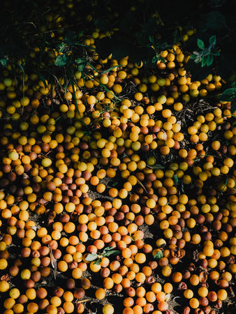 Ripe yellow plums lie on ground beneath branches of plum tree, forming vibrant and natural still life composition illuminated by sunlight. Ripe yellow plums scattered beneath plum tree branches