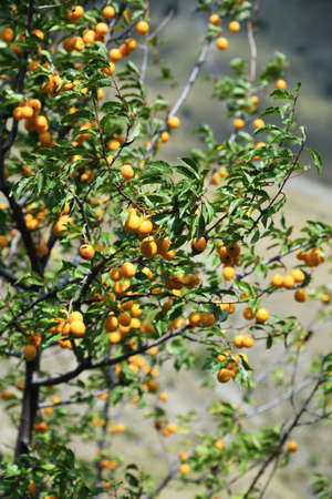 Large shrub of wild cherry plum or myrobalan plum. Caucasus, Russia, Chechnya. Prunus cerasifera. Ripe fruits native to Southeast Europe and Western Asia. Selective focus